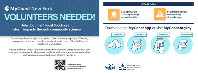 The MyCoast New York portal — developed by New York Sea Grant and the Cornell's New York State Water Resources Institute — is a photo-sharing platform where New Yorkers can upload pictures of flooding, storm impacts, litter, and more to help track and understand changes in our waterways. Learn more and download the MyCoast app on your mobile device: https://mycoast.org/ny