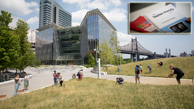 In early August 2018, New York Sea Grant conducted a climate-themed training for educators at CornellTech, Roosevelt Island, NYC during the STEM Institute teacher professional development training. (Inset) The book “The Teacher-Friendly Guide to Climate Change,” has reached 50,000 educators, including every public high school science teacher in New York City and two-thirds of all science teachers in New York state. Credit: Jason Koski/University Photography.