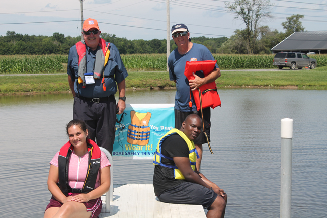 New York boating safety educators united to provide water safety training at the 2019 Empire Farm Days agricultural trade show and rural living showcase at Rodman Lott and Son Farms in Seneca Falls, NY. Clockwise from upper left: Gene Little, U.S. Coast Guard Auxiliary; Dave White, New York Sea Grant; Oliver Robinson and Rosaria DiSanto, New York State Parks Marine Services Unit. Each person is wearing a different type of life vest that was described and demonstrated on the pond at the event. Credit: Empire Farm Days.
