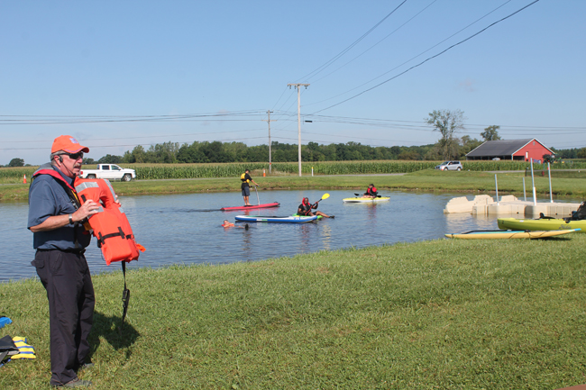 USCGA member Gene Little, left, describes the various styles of USCG-approved life preservers worn by demonstrators with Morgan Marine, New York Sea Grant, and the New York State Parks Marine Services Unit on the pond at the 2019 Empire Farm Days in Seneca Falls, NY. Credit: Empire Farm Days.
