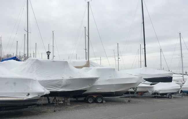Shrink wrap is a low-density polyethylene plastic used to protect boats during the winter storage and when shipping. Shrink wrap is not biodegradable, and can become a disposal problem at landfills and/or trash to energy plants. Credit: Christine Suter.
