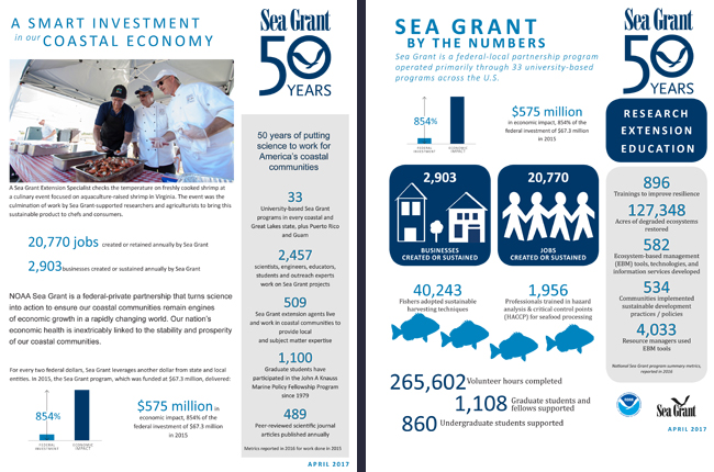 To learn more about why Sea Grant is a smart investment in our nation's coastal economy, check out NOAA Sea Grant's two-page fact sheet (pdf) as well as its nationwide "By The Numbers" one-page stats sheet (pdf) ...
