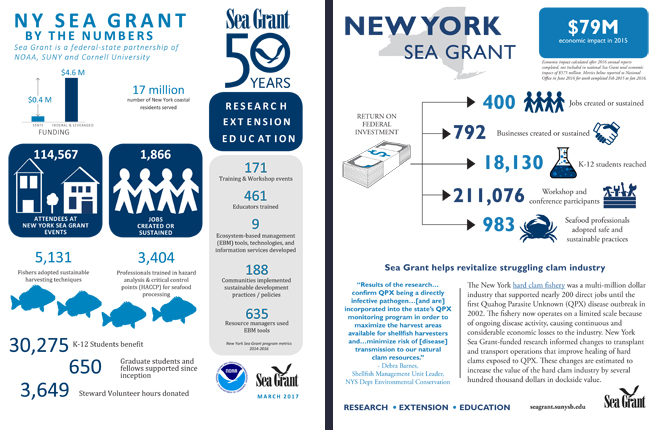 And, in New York, check out our "New York Sea Grant: By The Numbers" March 2017 one-page stats sheet (pdf) and July 2017 one-page economic impacts fact sheet (pdf) ...