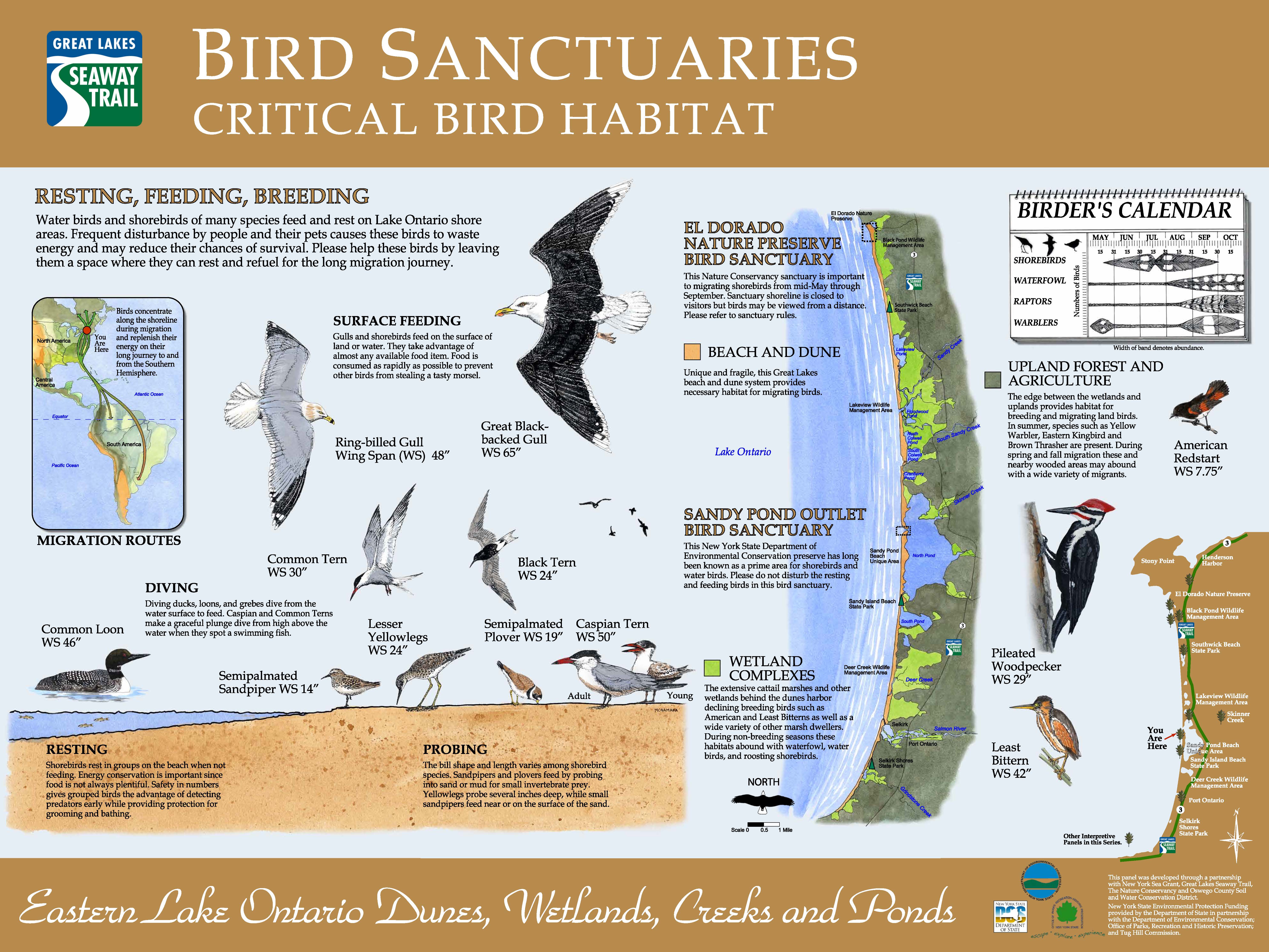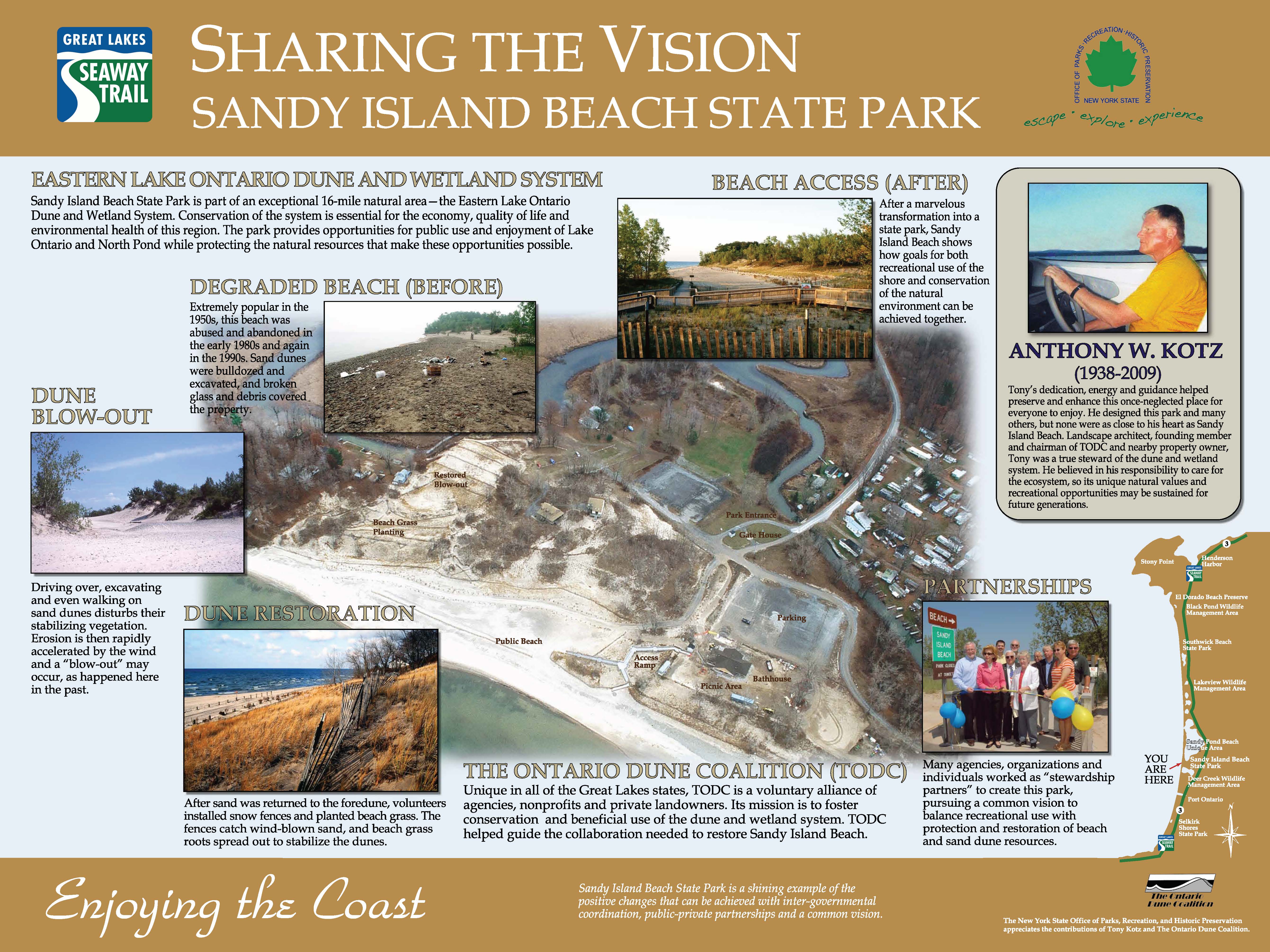 New York State Office of Parks, Recreation and Historic Preservation is hosting an interpretive panel at Sandy Island Beach State Park. This panel was developed in memory of the Eastern Lake Ontario Dune Coalition's former Chairperson, Tony Kotz. It also highlights the key to the coalition's success along ELODWA and partnerships.