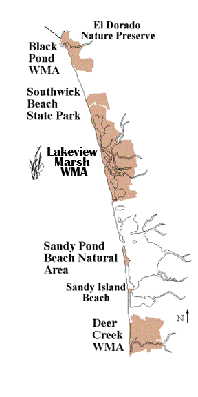 Trail description: The trail starts at Southwick Beach, passes through Lakeview Marsh WMA, and loops back to Southwick Beach. Along the way, you'll see many different habitats: woodlands, abandoned apple orchards, meadows, red cedar-maple forests, marshes, and sand dunes. A dune walkover on the trail enables you to cross the dunes without harming them. After crossing the walkover, take a right on the beach and follow it back to Southwick Beach State Park. This trail can be muddy so wear your boots!