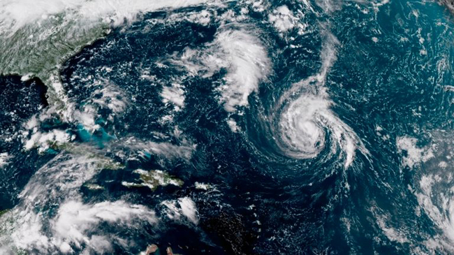 This enhanced satellite image shows Tropical Storm Florence, center, in the Atlantic Ocean in the afternoon of on Saturday, September 8, 2018. By the following morning the storm was upgraded to hurricane status. Credit: NOAA.