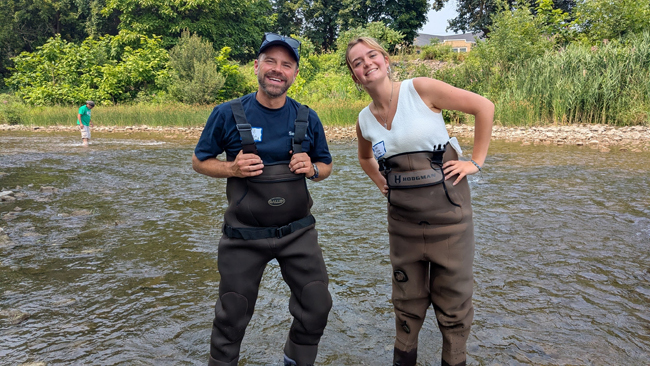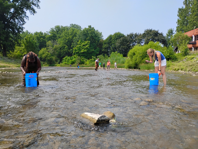 At GLEEE Workshop on August 4th, NYSG Great Lakes Literary Specialist Nate Drag (at left, pictured with Summer 2025  Community Engaged Intern Isabel Hahl) led participants in a streamside mussel survey, which is used to help determine how many mussels are present in our waterways. Credit: Nate Drag/NYSG
