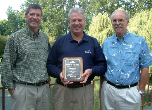 At the September meeting of the National Sea Grant Extension and Communications Leaders in Seattle, Washington, New York Sea Grant Associate Director and Extension Leader Dale Baker (center) received the William Q. Wick Award for Visionary Career Leadership. The award is the highest honor given to a Sea Grant Extension leader and is named for one of the founders of Sea Grant Extension. Baker, who has been NYSG’s extension leader since October 1995, began his Sea Grant career in the early 1970s working as an agent first at New York Sea Grant and then Minnesota Sea Grant. Baker plans to retire at the end of 2008. — Barbara A. Branca