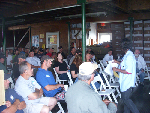 “Without a doubt, I’d rather learn here on the dock than offshore when it’s 5 degrees in February,” said John Scheu who’s been long lining for 27 years and currently goes out for tile fish on the Kimberly docked at Inlet Seafood. The Kimberly’s captain, Dave Tuma, and owner, Dan Farnham, were also in attendance.