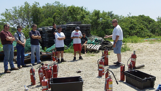 Fishermen learned life-saving tips about fire fighting. In a situation where there's an uncontrollable fire, they were instructed to notify Coast Guard and nearby vessels. Photo by Paul C. Focazio, NYSG.