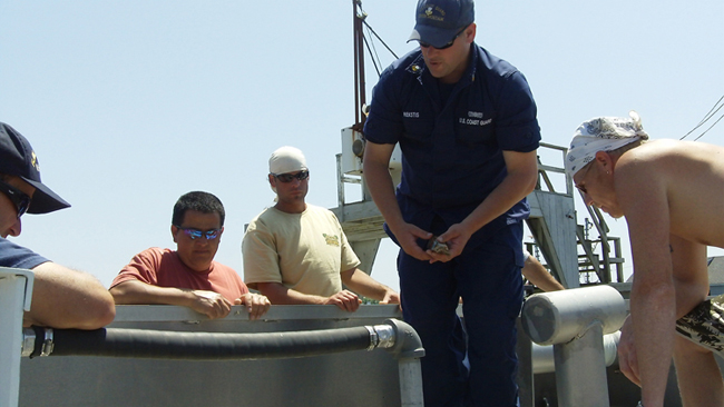 Lt. David Barnes of the US Coast Guard Marine Safety Detachment and his Unit provided a trailer that was used to teach fishermen how to address flooding incidents onboard. Some key points learned included: have all crew members know the location and operation procedures for the vessel’s pumping system; use any number of methods –power-driven, hand and/or fire pups, buckets – to de-water, keeping bilges dry and preventing loss of stability; and, if on a small vessel, crew should remain evenly distributed.