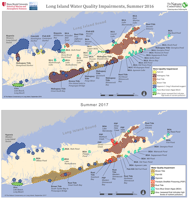 Ammerman stresses that the greatest successes in HAB management have come from dedicated leadership, a bottom-up collaborative governance process, specific ecological goals, and a reduction in all nutrient sources. Strategies like this have been successfully implemented with by the Tampa Bay Estuary Program and in Chesapeake Bay. More locally, he says that only 70 square miles of Long Island Sound exhibited hypoxic conditions in 2017, a continuing decrease probably due to the reduction in nitrogen loading.