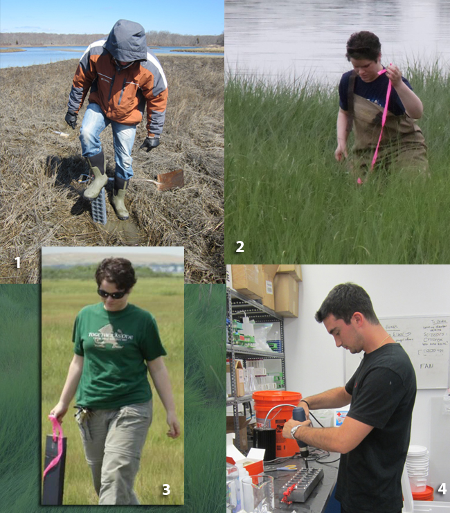 (1) Former technician Lucas Merlo installing porewater equilibrators in Mashomack (Shelter Island, NY); (2, 3) Mary Alldred retrieving porewater equilibrators — devices for sampling nutrients in water — from East Creek (Sands Point, NY); (4) Former SUNY Oswego undergraduate Louis Piscopo assembling porewater equilibrators for a summer research project at Stony Brook University.
