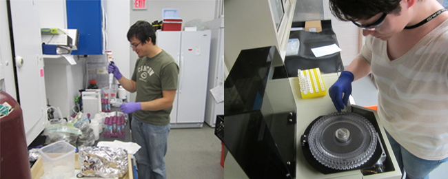 (At left) Former Stony Brook graduate student Stoycho Velkovsky running extractions to determine nitrogen availability in marsh sediment samples; (At right) Mary Alldred determining total carbon and nitrogen content of marsh sediments on an elemental analyzer in Dr. Alistair Rogers' lab at Brookhaven National Laboratory.