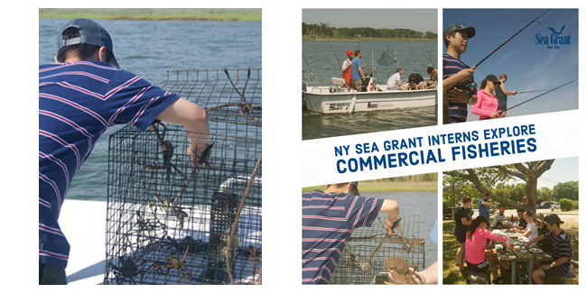 NYSG Intern Justin Chon (at left) clears a commercial crab trap during a commercial fishing trip with Capt. Peter Haskell. (at right) NYSG Interns explore commercial fisheries.