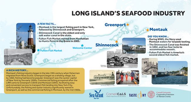 This past summer, NYSG supported the local tourism industry in another way, by partnering with CCE Nassau County to organize an information desk — available throughout July to distribute information about local seafood choices and seafood production at The Long Island Welcome Center. The center, at eastbound Exit 51-52 on the Long Island Expressway, opened on Oct. 20, 2016 and reportedly welcomes nearly 8,000 people a day. “Tourism and agriculture are critical drivers of the Long Island economy and with the new Welcome Center, we are making smart investments to support these industries throughout the region,” said New York Governor Andrew Cuomo. For more posters from this effort, see "NYSG Summer 2018 Intern Encourages Support for Local Fishing Businesses." Credit: Design by Loriann Cody.