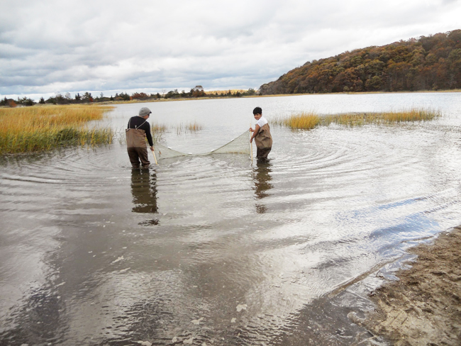 Student stewards from Brentwood High School studying the waters (and inhabitants) of Sunken Meadow Creek at Sunken Meadow State Park in Kings Park, NY, a designated LIS Stewardship Area. Credit: Amy Mandelbaum, NYSG/LISS.