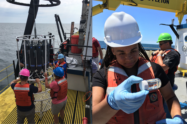 Teachers aboard the U.S. EPA Research Vessel (R/V) Lake Guardian participate in Great Lakes research on Lake Ontario in 2018. Credit: NYSG/Helen Domske.