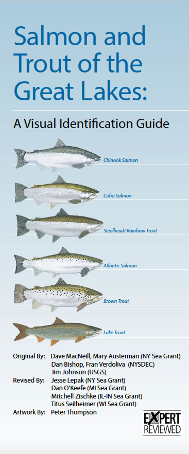 Ithaca, NY, March 15, 2019 - New York Sea Grant’s (NYSG) first-ever full-color visual identification guide for the salmon and trout species found in Lake Ontario, which was released in Spring 2012, is the inspiration for a new Great Lakes-wide brochure produced by Illinois-Indiana Sea Grant in collaboration with NYSG as well as Sea Grant programs in Michigan and Wisconsin.