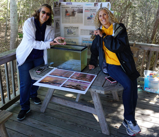 Two of the 2019 Mentor Teachers, Amy Olander (left) and Veronica Morabito-Weeks, who conducted a workshop centered around runoff and nitrogen pollution. The pair illustrated how to use oyster tanks to demonstrate water filtering in the classroom. Credit: Jimena Beatriz Perez-Viscasillas/LISS