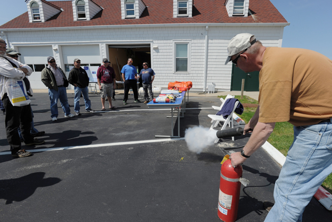 Ted Williams, Sales and Marine Safety Coordinator with Hercules Securing Lifting and Rigging, demonstrates the proper use of a fire extinguisher during a passenger vessel safety event held at Coast Guard Station Montauk, N.Y., Wednesday, May 17, 2012. The event was designed to teach basic safety and survival at sea to the captains and crews of local charter fishing vessels. Coast Guard photo by Petty Officer 1st Class Thomas McKenzie.