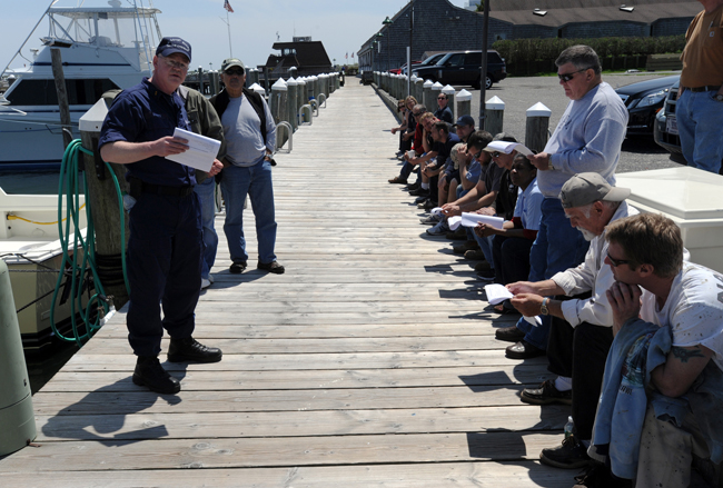 Coast Guard Auxiliarist Michael Doherty reviews the procedures of a vessel safety inspection with the captains and crews of vessels during a passenger vessel safety event held at Coast Guard Station Montauk, N.Y., Wednesday, May 17, 2012. The event was designed to teach basic safety and survival at sea to the captains and crews of local charter fishing vessels. Coast Guard photo by Petty Officer 1st Class Thomas McKenzie.