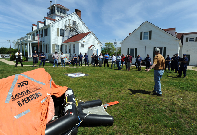 “The training went great,” said Ted Williams, Sales and Marine Safety Coordinator with Hercules Securing Lifting and Rigging, whose survival gear demonstration included the discharge of a fire extinguisher, the deployment of a (dud) flare and the inflation of a six-person life raft on the station’s grounds. “If what we did will help save a life, it’s worth it. I’ll train one person if I have to. One or one hundred, it doesn’t matter.”