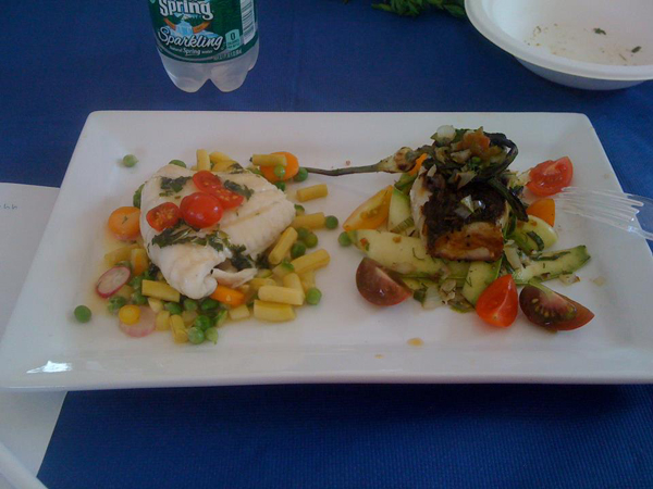 The winning dish by Kingston Station at a Northwest Atlantic Marine Alliance (NAMA)-sponsored Seafood Throwdown event held on June 27, 2012 at Boston's City Hall Plaza. The event also marked an announcement of the end of 70+ prohibition on selling local seafood at the city's farmers markets. NAMA's Niaz Dorry, also one of the event judges, sampled yellowtail flounder and bluefish cooked by four different Boston area restaurants, with Kingston Station coming out ahead of the pack.