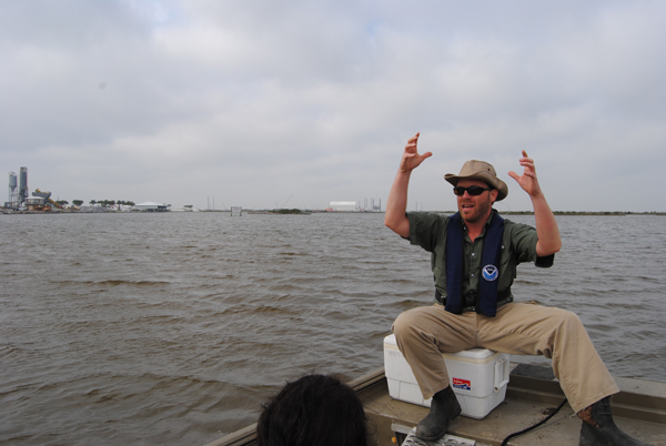 Healthy wetlands support our fisheries, our industry, and our communities,” said Mel Landry, a Marine Habitat Resource Specialist with NOAA's Restoration Center. Landry is sitting on a boat heading to Port Fourchon's Maritime Forest Ridge from the mainland's marina. “By restoring habitat, we are preserving an engine of job-creation and economic growth.”