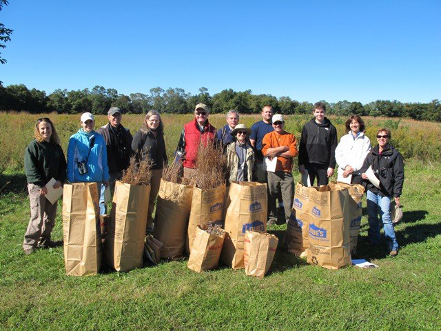On Saturday, October 13, 2012, volunteers participated in a Stewardship Day at Caumsett State Historic Park Preserve in Lloyd Neck, NY. Nearly 20 volunteers collected eight lawn bags full of seed from four types of native plants: big bluestem, milkweed, goldenrod, and black-eyed susan. The seeds that were collected will be used in a Long Island Sound Futures Fund habitat restoration project to restore native grasslands at Caumsett State Historic Park Preserve, as well as other restoration projects in the park and on Long Island. Grasslands provide critical habitat to many species of birds, butterflies, and other wildlife and this type of habitat is rapidly disappearing on Long Island due to development and ecological succession. Photo by Larissa Graham.