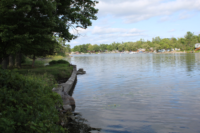 Shoreline erosion can be accelerated adjacent to man-made features, where deflection of waves can attack unprotected shorelines with more energy. Planning for erosion management with neighboring property owners (or managers) can help improve the resiliency of a shoreline (like this one in Port Bay, NY) to lake erosion. Credit: New York Sea Grant/Roy L. Widrig