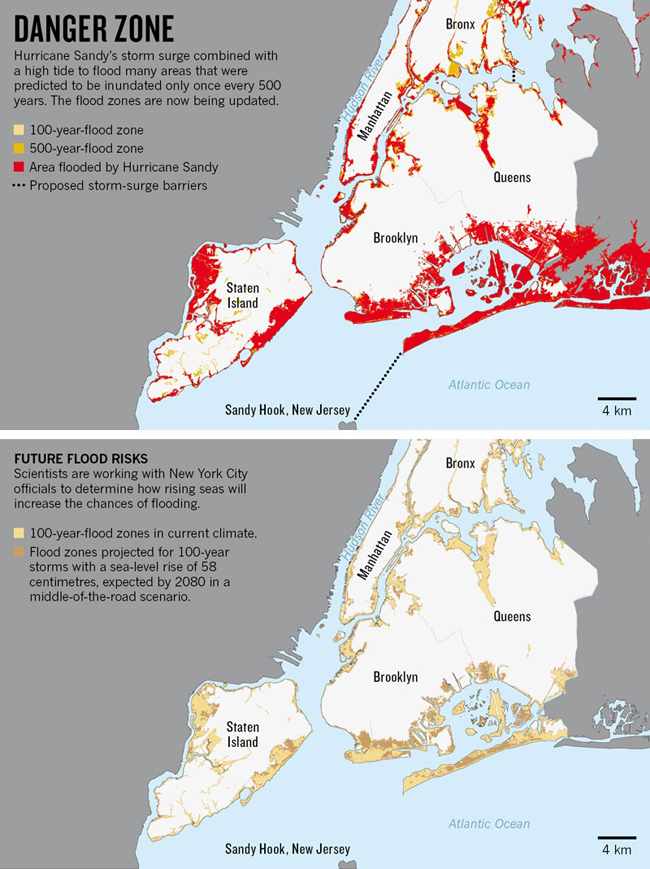 In the wake of Hurricane Sandy, this three-page February 2013 Nature Magazine feature article (pdf) sheds light on what scientists and officials are doing to try and protect New York City from future floods