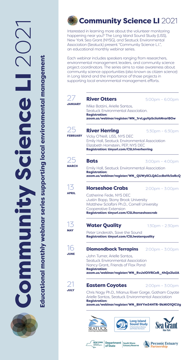 Seatuck Environmental Association, Long Island Sound Study, and New York Sea Grant are hosting the series together.
