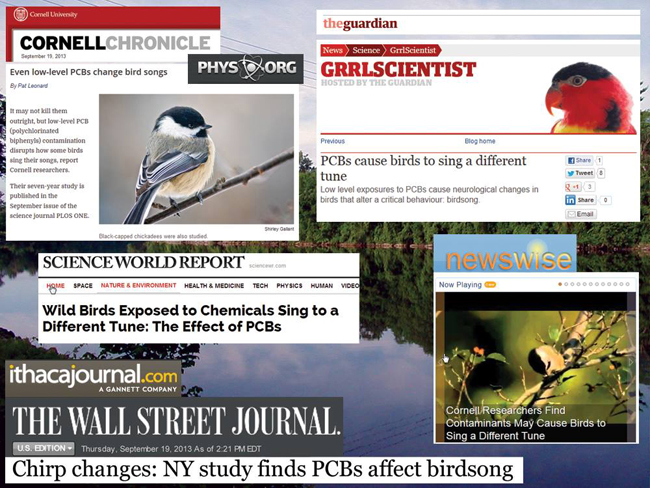 “Effects of PCBs are extremely complicated,” says co-author André Dhondt, director of Bird Population Studies at the Cornell Lab of Ornithology. “What this demonstrates is that most previous PCB studies may not give us the whole picture because they did not look at the specific type of PCB involved but just measured overall levels. What Sara did was not easy. She found effects on the song and wanted to do more than just document that there was an effect, but to isolate what was causing it.”