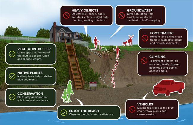 Composed of loose sediments that range from very small clays to large boulders, the bluffs are vulnerable to erosive forces such as wind, waves, and other influences.