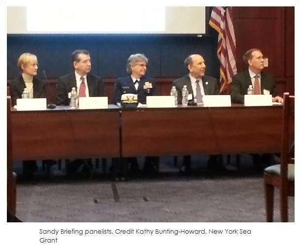 Friday, November 22, 2013, Washington, DC - Staff and stakeholders of the National Oceanic and Atmospheric Administration (NOAA) held a congressional briefing on NOAA’s role in supporting coastal communities before, during, and after Sandy’s impact. The briefing took place on Wednesday November 20th, 2013, just weeks after the one year anniversary of the devastating coastal storm. Representatives from across the NOAA spectrum spoke discussing a wide range of issues including National Weather Service forecasting, National Marine Fisheries Service rapid fisheries stock assessment and the “boots on the ground” approach of New York Sea Grant. The talks highlighted best practices that helped communities and decision-makers during the difficult time leading up to and after Sandy, as well as the important lessons learned to prepare for future storms. The engaging presentations offered a succinct follow-up, summarizing NOAA’s overall response to Sandy.