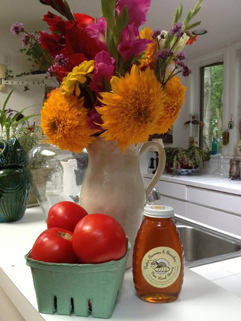 Some of the bounty "Grown on Long Island," as taken by emcee Bonnie Grice. "Proud to have been the emcee today for the Seafood Throwdown!," she said. "My compliments to the chefs and thanks to Barbara and everyone who make this happen each year." As for the weather, she added, "A little wind and rain didn't dampen our spirits." The flowers and homemade honey pictured above were made possible by Rocky from Pattys Berries & Bunches in Mattituck, NY.