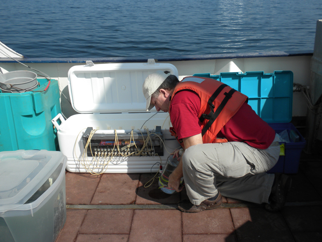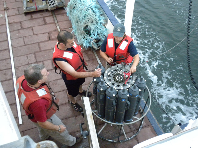 This instrument is called a rosette. It has a CTD mounted in the center to measure salinity, temperature, pressure, and dissolved oxygen. The grey bottles around it are called Niskin bottles. These are use to collect water samples. The rosette is lowered off the side of the boat from a winch and at different depths, it collects the water that we then process on deck. NYSG-funded researcher Gordon Taylor is pictured at far left.