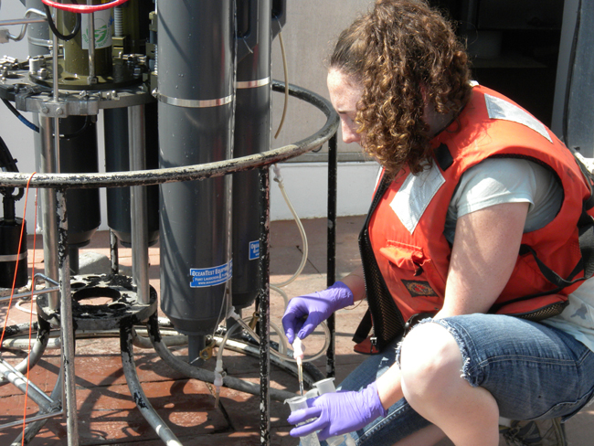 Suter rinsing syringes with seawater for measuring nutrients. Before collecting the sample, the plasticware was rinsed with the same water that was going to be sampled.