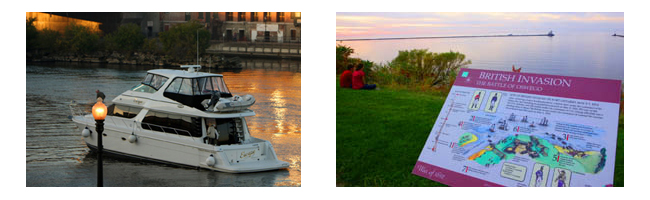 Oswego County waterfront businesses cater to boating enthusiasts. This cruiser is touring the Oswego River at sunset; (Above, Right)