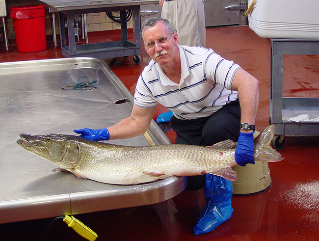 Dr. Paul Bowser holds a muskellunge impacted by VHSV.