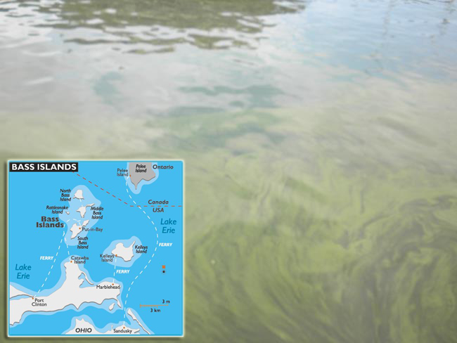 As seen in this September 2011 picture, it's pretty easy to spot the HABs that plague Lake Erie's waters in the summer months. Most HABs are caused by planktonic bacteria, which are suspended in the water and rely on currents to move them. Near Ohio's South Bass Island, you'll find Microcystis blooms, which have been at high levels in recent years during the summer months. Photo: Paul C. Focazio, NYSG.