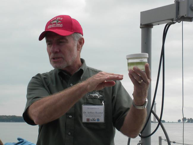 Knowing what triggers HABs is key to reducing their occurrence and impacts - they may be minimized, and some completely avoided, by reducing the nutrients (such as phosphorus or nitrogen) and pollutants added to the water. "Everyone agrees that phosphorus reduction is the key to reducing harmful algal blooms," says Ohio Sea Grant Director Jeff Reutter (pictured below aboard the R/V Gibraltar III in the waters around Ohio's, Bass Islands, a small series of islands in the southwestern corner of Lake Erie). "The problem is of such a large magnitude that a 5 or 10 percent reduction in phosphorus won't get us anywhere. We'll need to reduce it by 65 or 70 percent." Photo: Paul C. Focazio, NYSG.