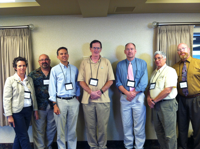 Some of the presenters and hosts from one of Sea Grant's July 2013's harmful algal blooms workshop held in upstate New York included: (l-r) New York Sea Grant's Associate Director Kathy Bunting-Howarth; NYSG Fisheries Specialist Dave Mac Neill; Stony Brook University School of Marine and Atmospheric Sciences investigator Chris Gobler; State University of New York (SUNY) College of Environmental Science & Forestry investigator Greg Boyer; NYSDEC Bureau of Water Assessment Management's Scott Kishbaugh; Ohio Sea Grant extension specialist Frank Lichtkoppler; New York State Department of Health's James Hyde. Photo: Courtesy of Helen Domske, NYSG.