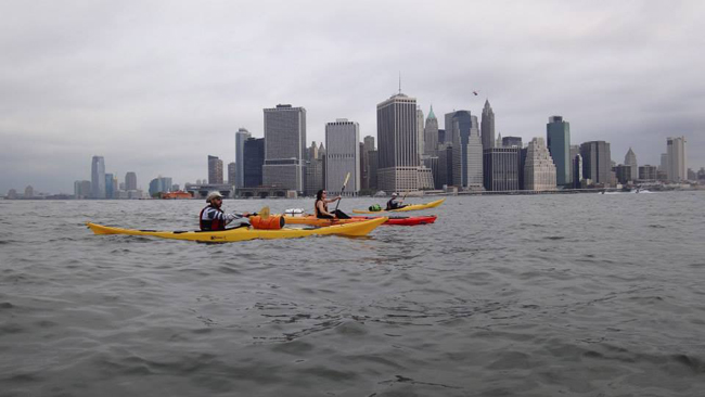 Kayakers in the Hudson River with NYC's financial district as their backdrop.