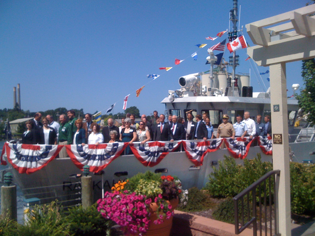 Oswego, NY, August 6, 2014 - Several New York Sea Grant staffers were on-hand for a ceremony at the Lake Ontario Event Center to celebrate the U.S. Geological Survey's newest research vessel, The R/V Kaho.