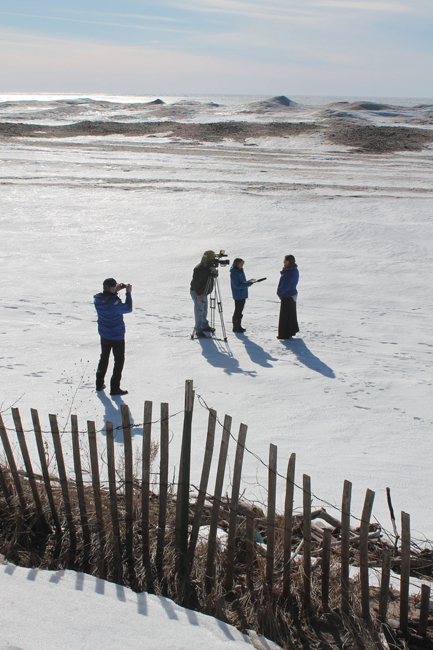 PHOTO: New York Sea Grant Recreation and Tourism Specialist Dave White captures a photo as New York Sea Grant Coastal Community Development Specialist Mary Penney is interviewed by News Channel 9 Reporter Rachel Polansky and Photojournalist Bill Goldschmidt. The background shows frozen ice dunes along the eastern Lake Ontario shoreline. Photo: Kara Lynn Dunn