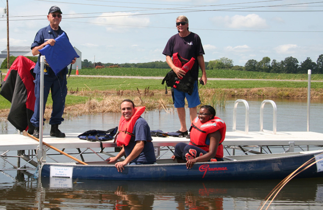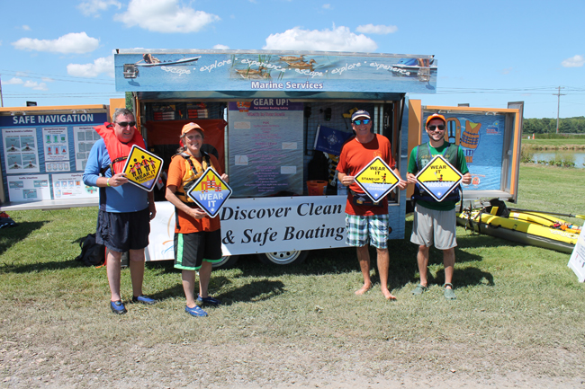 Dave White, 2nd from right, developed a partnership that included the Coast Guard Auxiliary and NYS Parks Marine Division for water safety education at the 2015 Empire Farm Days event in Seneca Falls, NY, in August. With White are, left to right, Coast Guard Auxiliary Flotilla 2-2 Commander Gene Little, NYS Parks Marine Services Bureau Education Specialist Ro Woodard, and SUNY College of Environmental Science and Forestry graduate student Daniel Rockefeller.