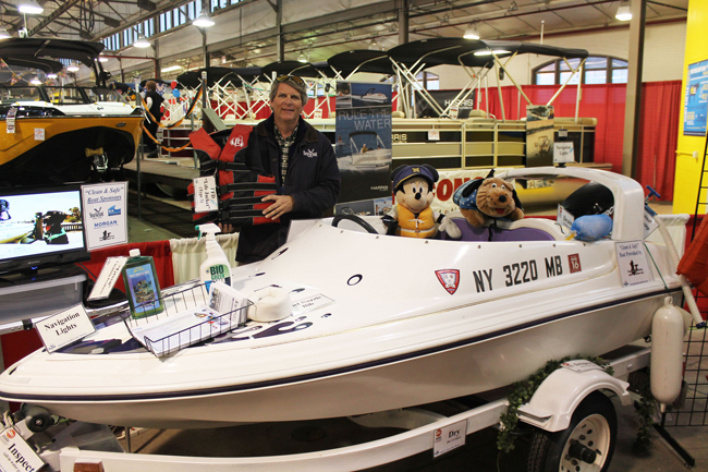 New York Sea Grant Coastal Recreation Specialist Dave White with a past Discover Clean and Safe Boating educational vessel at the show. The new one, a round boat, will be revealed at the 2016 Central New York Boat Show.