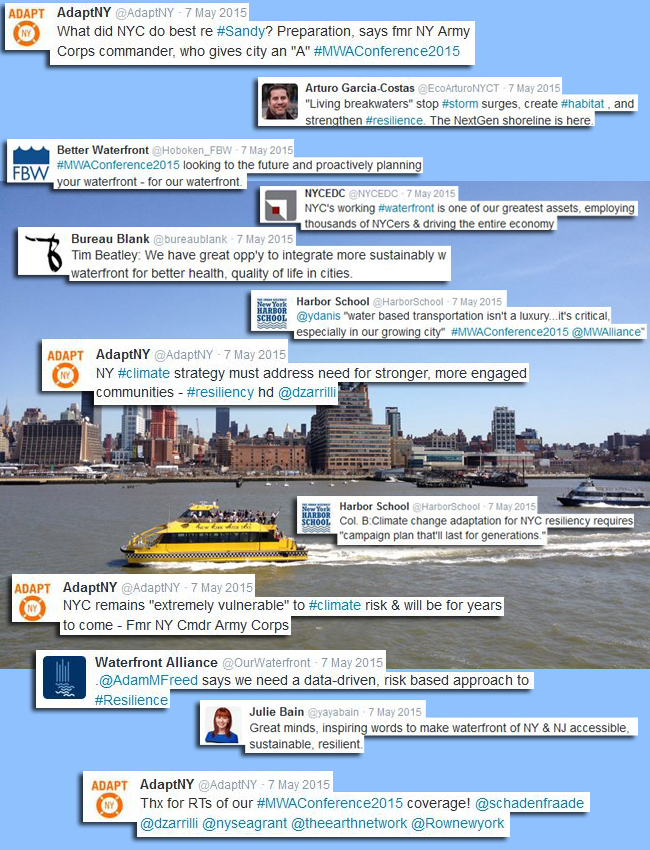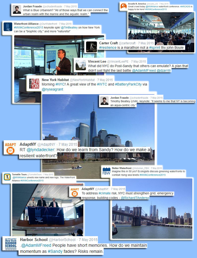 At last year's event, the then-named Metropolitan Waterfront Alliance announced that by summer 2015 it would become known as "The Waterfront Alliance," a time when it would also roll out its new branding, including a refreshed Web site and design for its e-newsletter, WaterWire. During the conference's welcoming remarks, board chairman Chris Ward announced the news, and President and CEO Roland Lewis and board members offered a peek at the organization's new logo. This and other moments from the day were documented via Twitter. Those tweets are displayed in some collages compiled by New York Sea Grant's Web Content Manager Paul C. Focazio, who was in attendance.